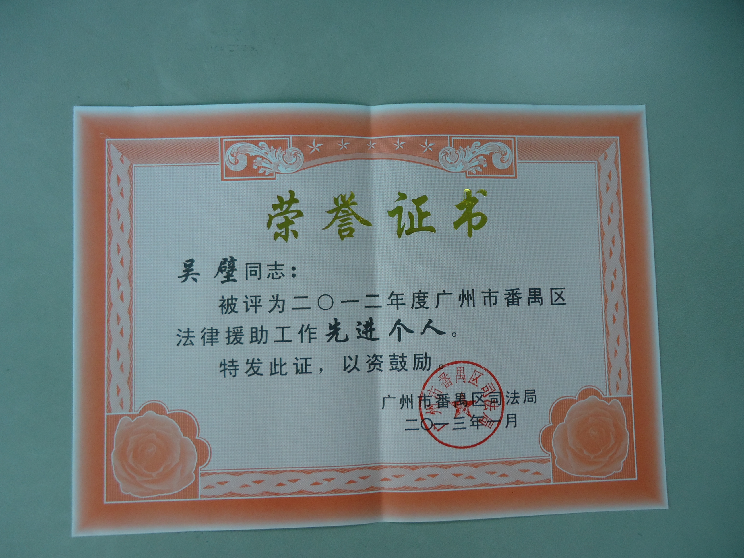我所吴壁律师被广州市番禺区司法局评为广州市番禺区法律援助工作先进个人。祝贺!